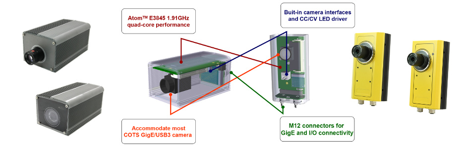 iVIS-200 obsahuje procesor Atom™ E3845, který tvoří část inovativního rámce inteligentní kamery. Integrujte vaši běžnou kameru a vytvořte si tak vlastní x86 inteligentní kameru.