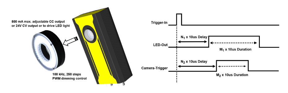 iVIS-200 disponuje zdrojem 500 mA/24 V pro přímé řízení LED světla. Podporuje PWM pro změnu intenzity světla. Kombinace DTIO a MCU zajišťuje možnost ovládat blesk a spoušť kamery s přesností 10 us.